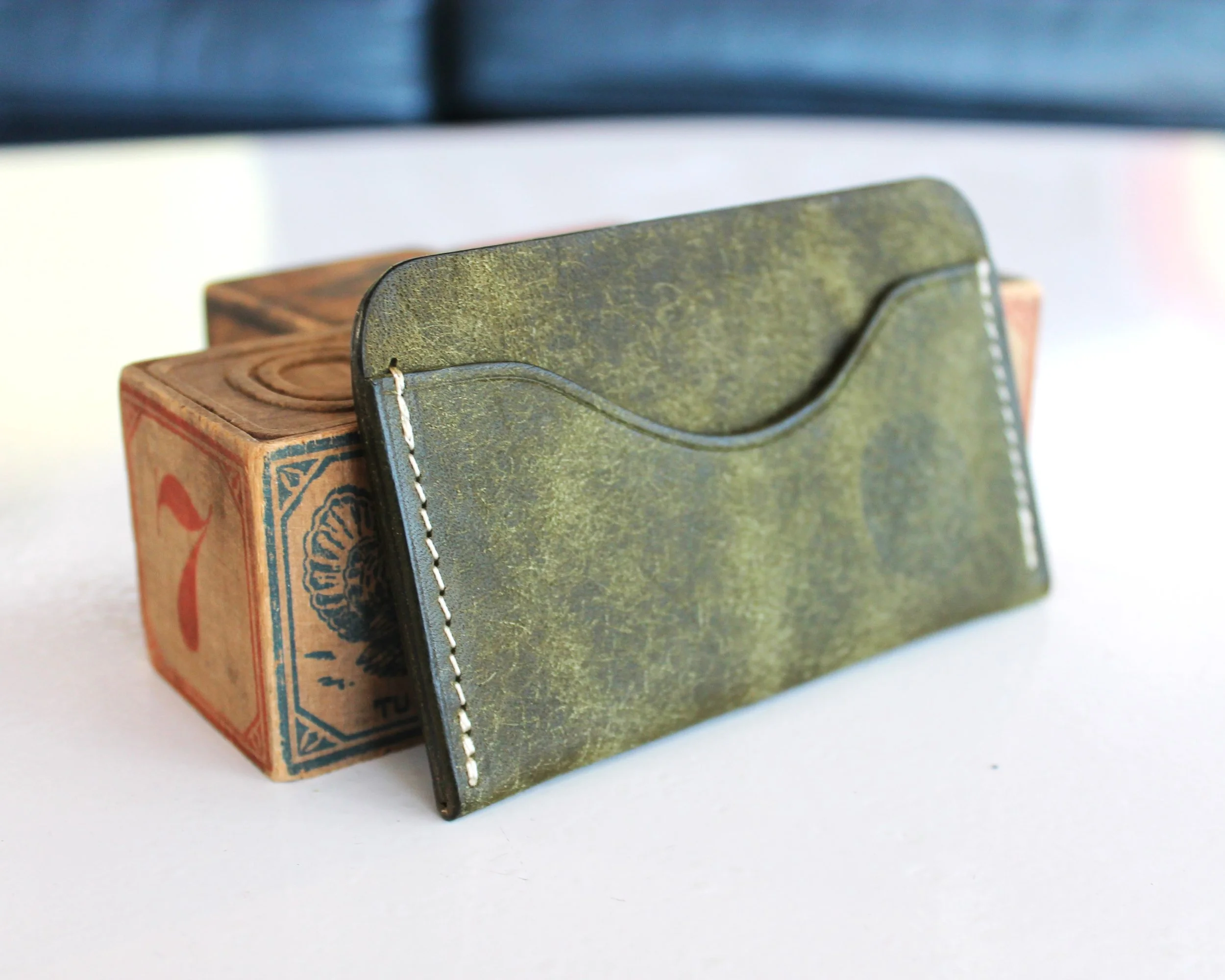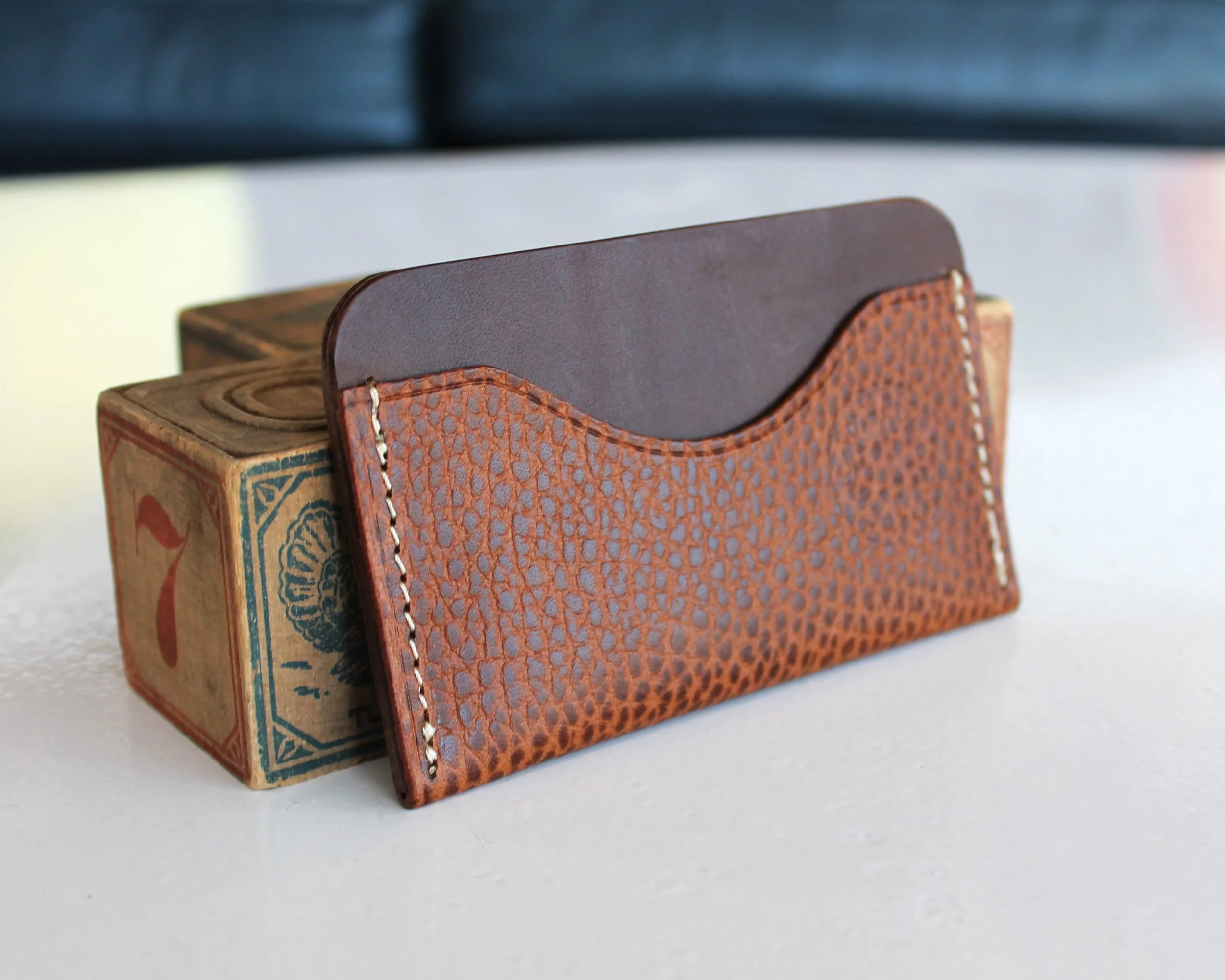 A unique take on a classic card wallet. Features 3 slots, 2 for cards and a large one that can hold folded cash or receipts. Made from a combination of two great Italian vegetable tanned leathers. A perfect minimalist option for those who don’t carry a lot, but want to make sure what they do stays organized.